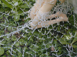 蜘蛛の巣はおよそ4000個のビーズとテグスでレースのように編んで作りました。
